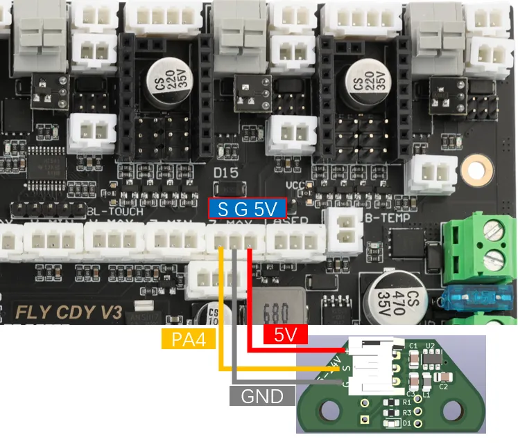 Klicky为第三方的调平传感器,能够用极低的成本自己在家制作,且性能稳定,性价比高,推荐使用。接线方法如下图所示。