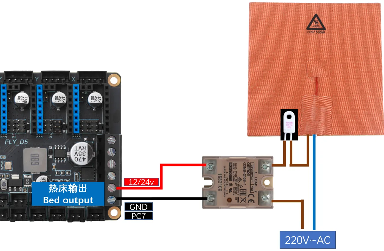 • 交流热床: 固态继电器在接线时,请注意输入和输出别接错了。