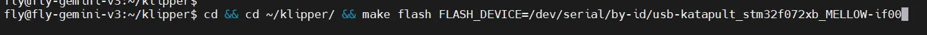 =后面没有空格。请将<你的主板ID>替换为上一步查询到的IDcd ~/klipper/ && make flash FLASH_DEVICE=<你的主板ID>