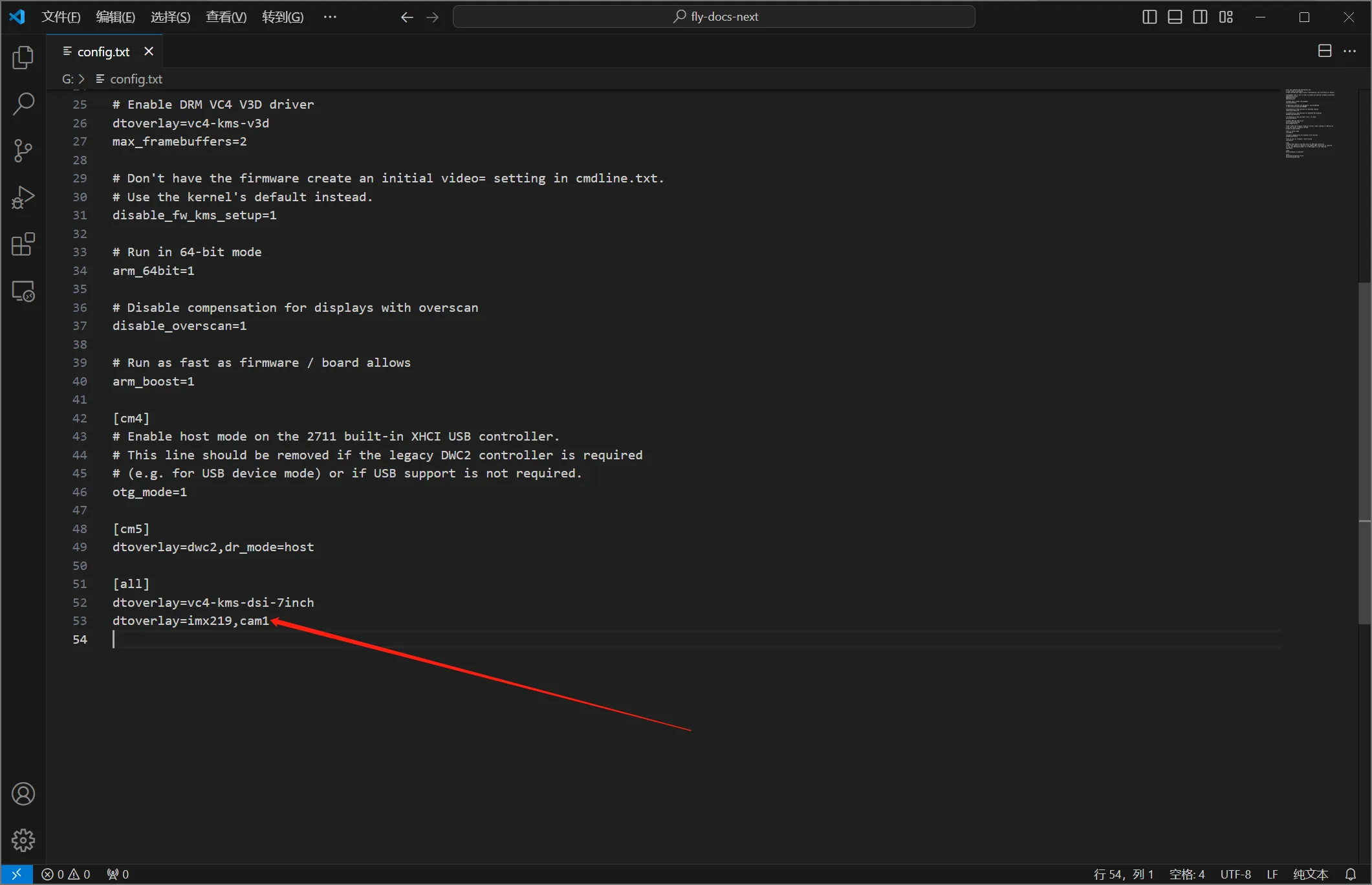 上位机类FLY-CM4 扩展板CSI摄像头使用方法本页总览csi主板接线 CSI使用 CSI使用方法 镜像烧写完成后,进入/boot/config.txt中找到camera_auto_detect=1并且修改成camera_auto_detect=0然后按着摄像头型号添加配置 下方是参考配置 dtoverlay=imx219,cam1