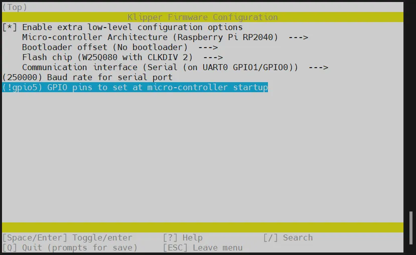 ESC,用于返回上一级菜单 Q键,用于退出Klipper固件配置页面Y键,在退出Klipper固件配置页面时,如果有提示,则点击Y键保存配置文件