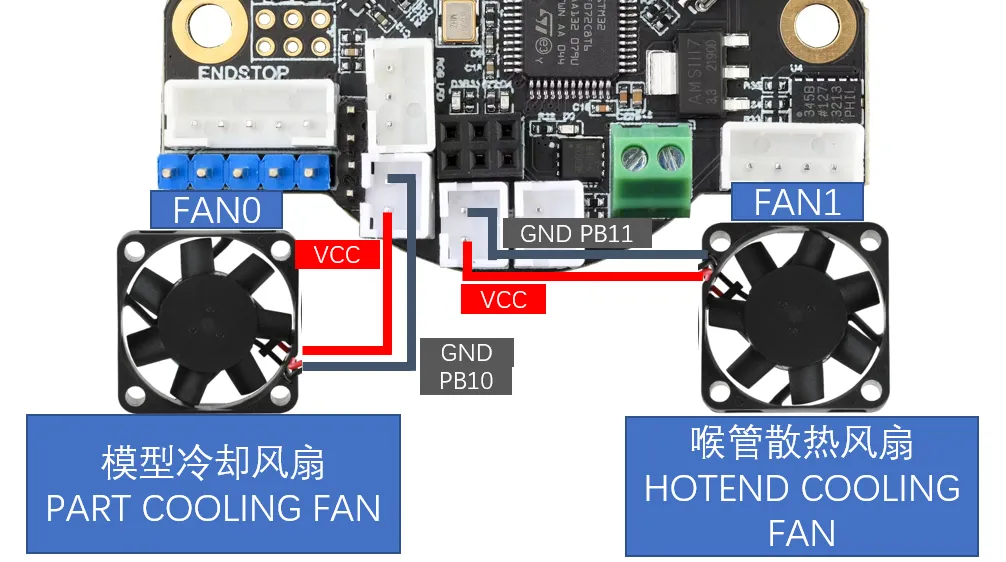 SHT36支持最多两个可控风扇,风扇电压为电源电压,接线方法如下。