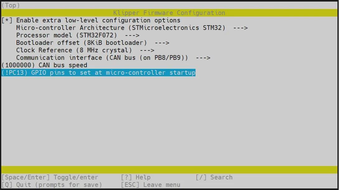 • 其中 rm -rf ~/klipper/.config && rm -rf ~/klipper/out是删除之前编译数据与固件make menuconfig是编译固件,执行后应该出现下方界面