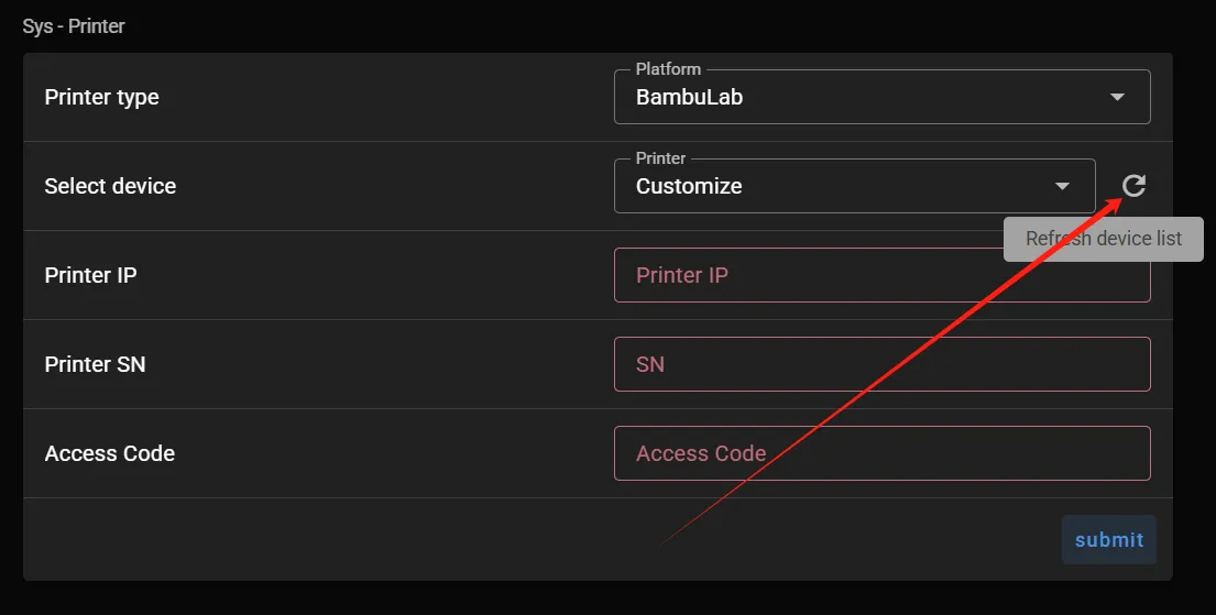 • If your printer never refreshes and appears, you can choose to enter it custom. Manually enter the IP address and serial number of the printer.