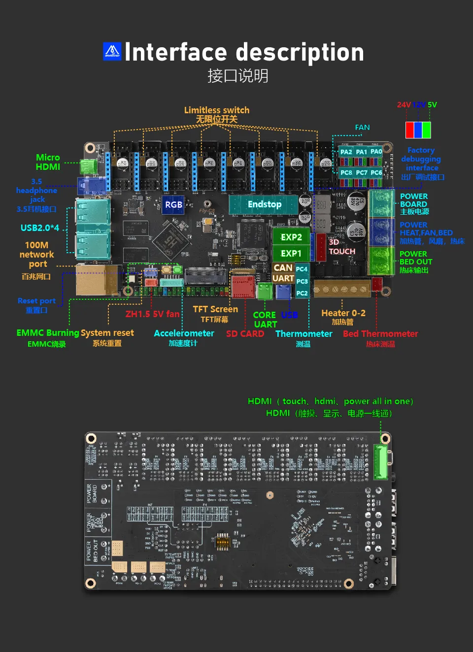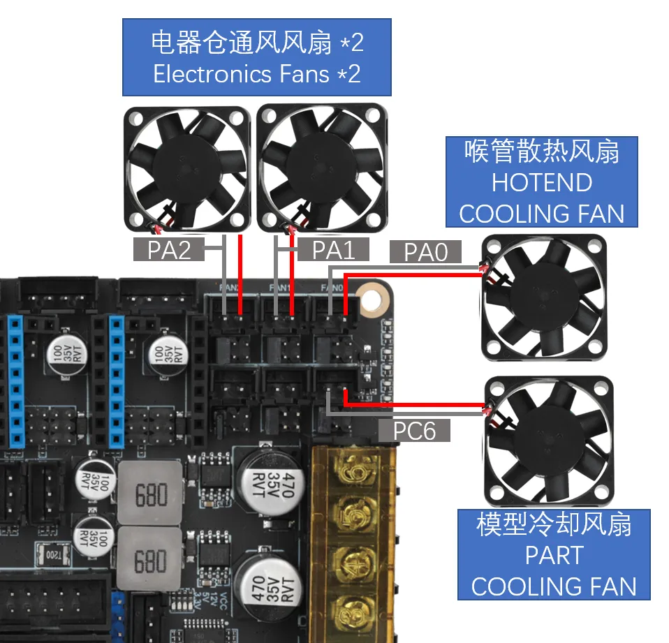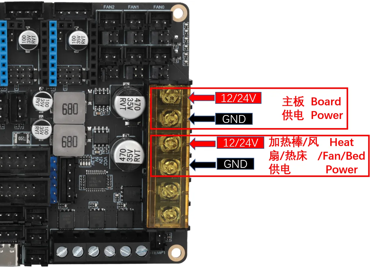 DC Bed: When connecting the onboard MOS to a DC bed, pay attention to the power usage. The maximum current for a DC bed cannot exceed 10A. If the current exceeds 10A, it is recommended to use an external MOS module to use the bed, otherwise, it may cause irreversible damage to the motherboard.