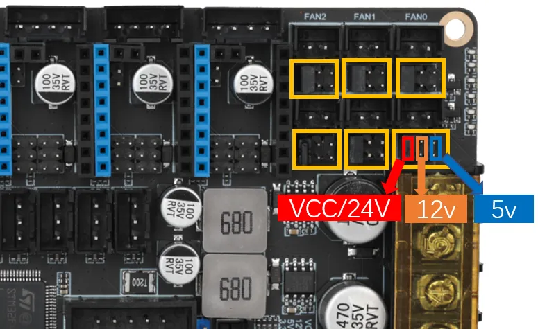 tipChoose the fan voltage. By shorting the corresponding voltage pins with a jumper cap, choose as shown in the following diagram. Note: The jumpers within the yellow boxes in the diagram are the same. Incorrectly choosing the fan voltage may damage the fan or MOS module.