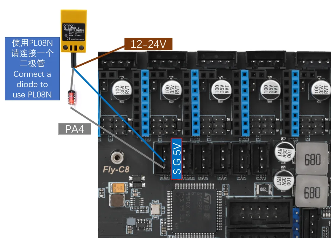 VORON officially recommends using the Omron TL-Q5MC sensor (previously, PL08N was recommended, but the principles are the same, only the detection distance differs) for bed leveling. The wiring method is as shown below.
