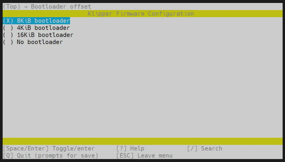 ESC,用于返回上一级菜单 Q键,用于退出Klipper固件配置页面Y键,在退出Klipper固件配置页面时,如果有提示,则点击Y键保存配置文件