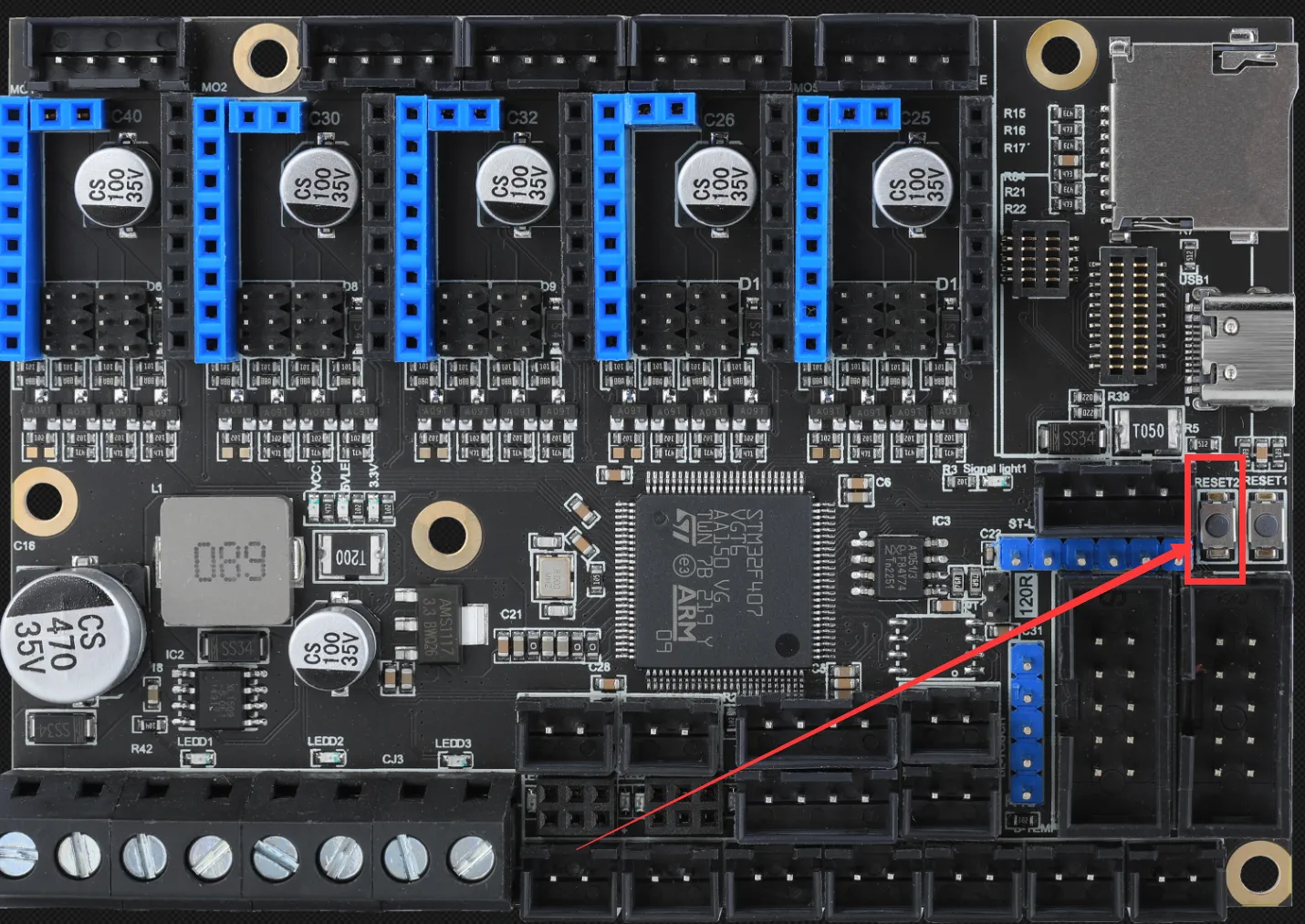 The button on the right is the BOOT button, and the one on the left is the RESET button.