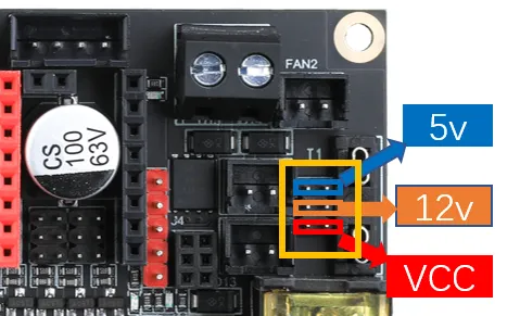 tipFan voltage selection. Short the corresponding voltage pins with a jumper cap. The selection method is as shown in the figure. Note: The jumper configurations in the yellow box are the same. Note!!!! Incorrect fan voltage selection may damage the fan or MOS module.