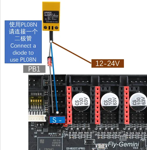 VORON recommends using the Omron Omron TL-Q5MC sensor (previously, the official recommendation was PL08N, which has the same principle but different detection distance) for bed leveling. The wiring method is as shown in the figure.