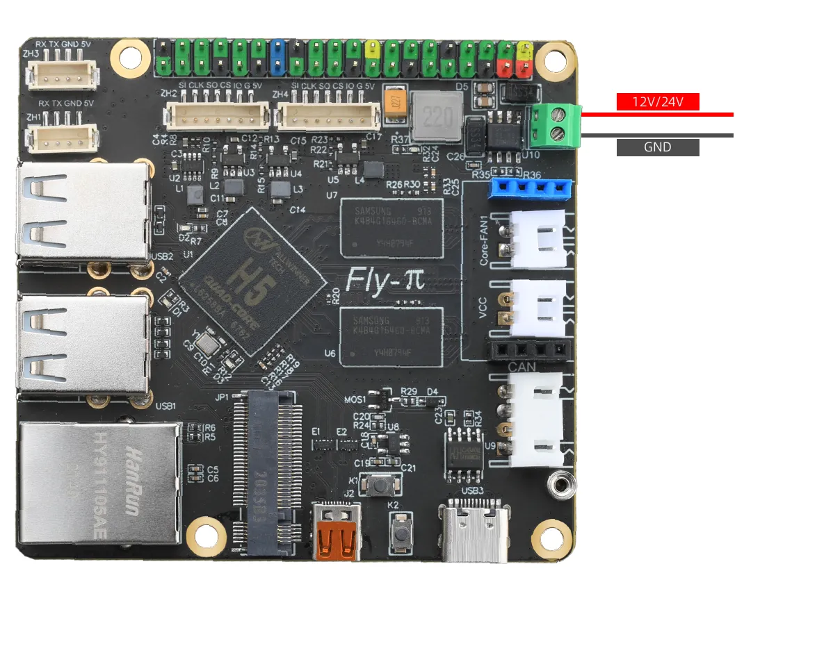 Host computerFLY-Pi上位机供电On this pagePower Supply for Host Machine tipThere are two power supply methods for FLY-Pi-V2. Using a 12-24V power supply, the wiring method is as shown in the following figure Using TypeC interface for power supply