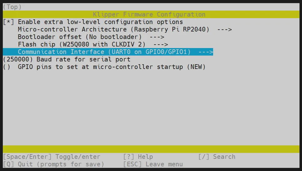 cd ~/klipper && rm -rf ~/klipper/.config && rm -rf ~/klipper/out && make menuconfig