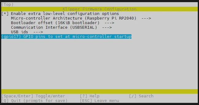cd ~/klipper && rm -rf ~/klipper/.config && rm -rf ~/klipper/out && make menuconfig