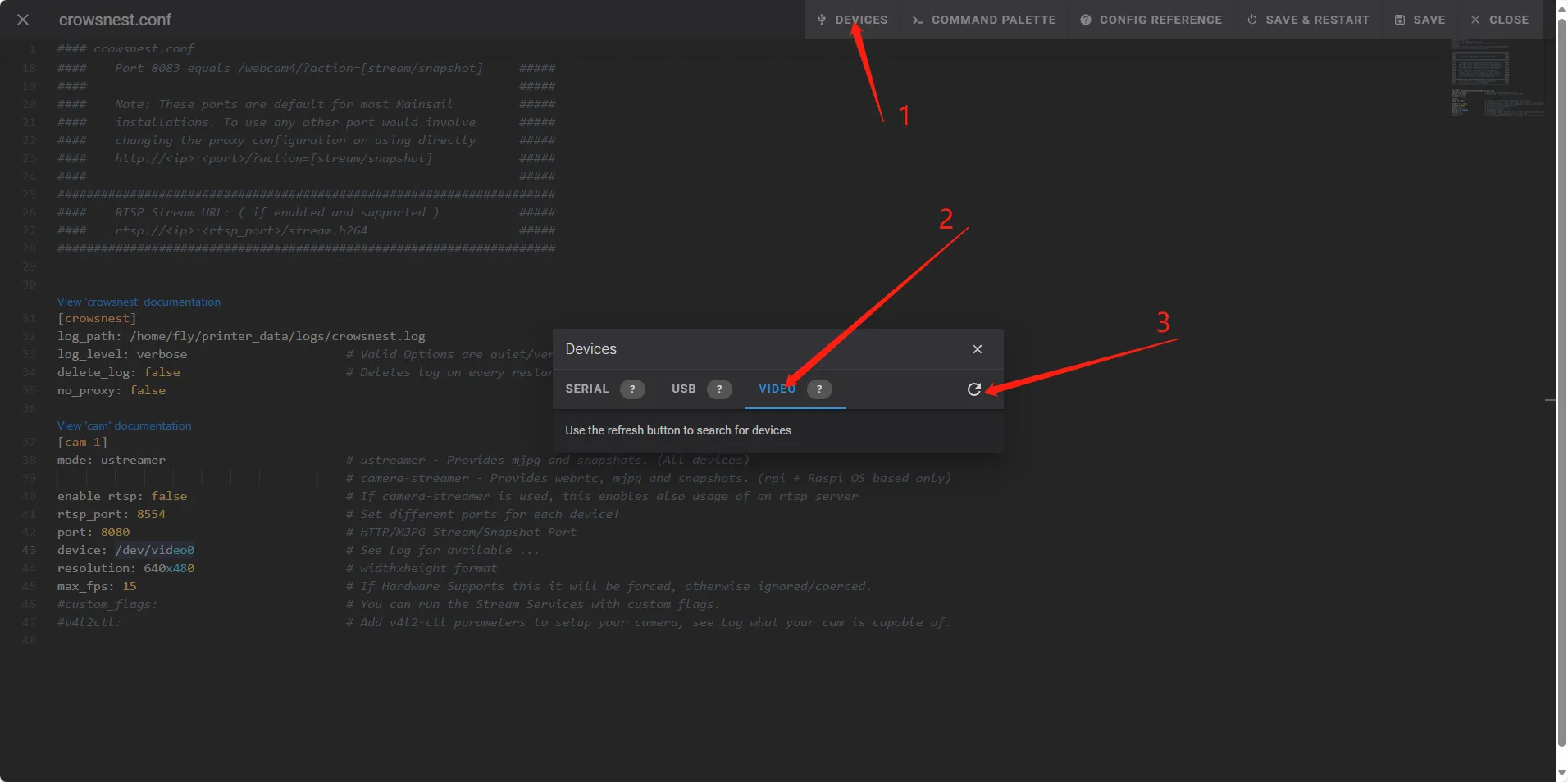 • Dans Fuidd, trouvez le fichier de configuration, puis ouvrez crowsnest.conf