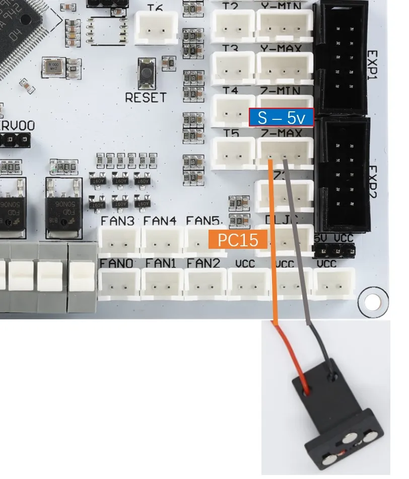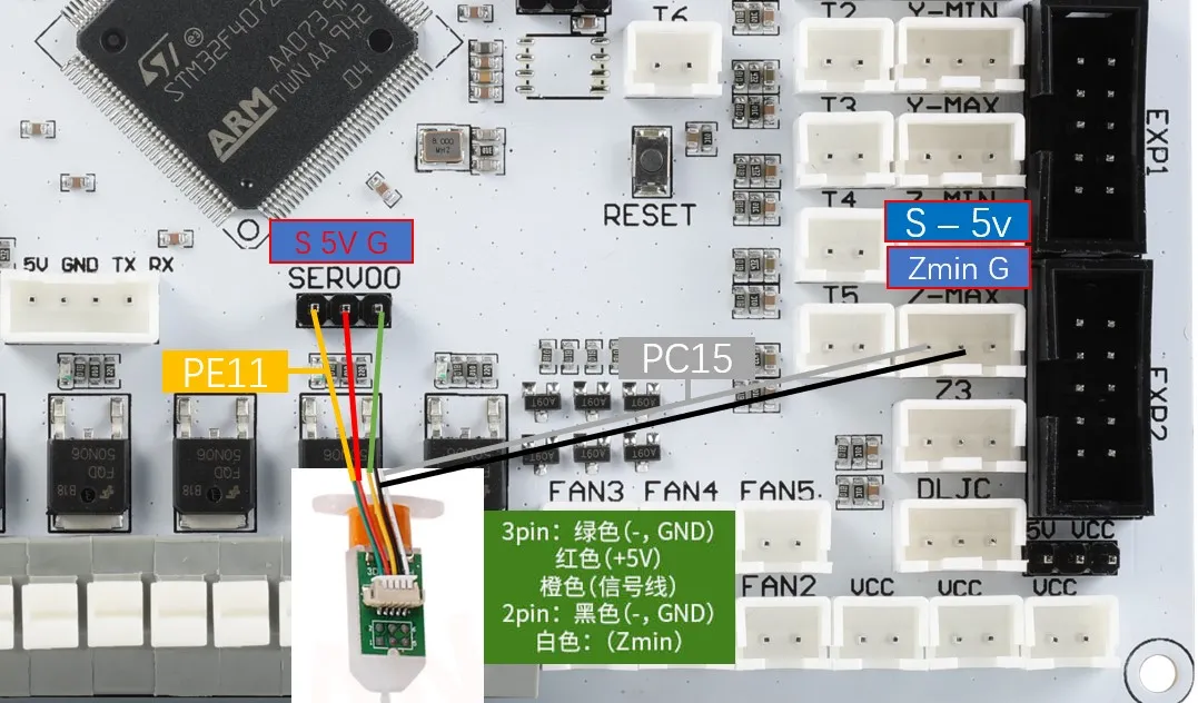 Le BL-Touch a en tout cinq fils, trois pour le premier groupe qui gère l'alimentation du capteur et le déploiement/rétraction de la sonde, et le deuxième groupe pour la masse et le signal, qui sort le signal de fin de course. Lors de la connexion du BL-Touch, vérifiez soigneusement l'ordre des fils, une connexion incorrecte peut endommager de manière permanente le capteur et la carte mère !!! La méthode de connexion est illustrée comme suit.