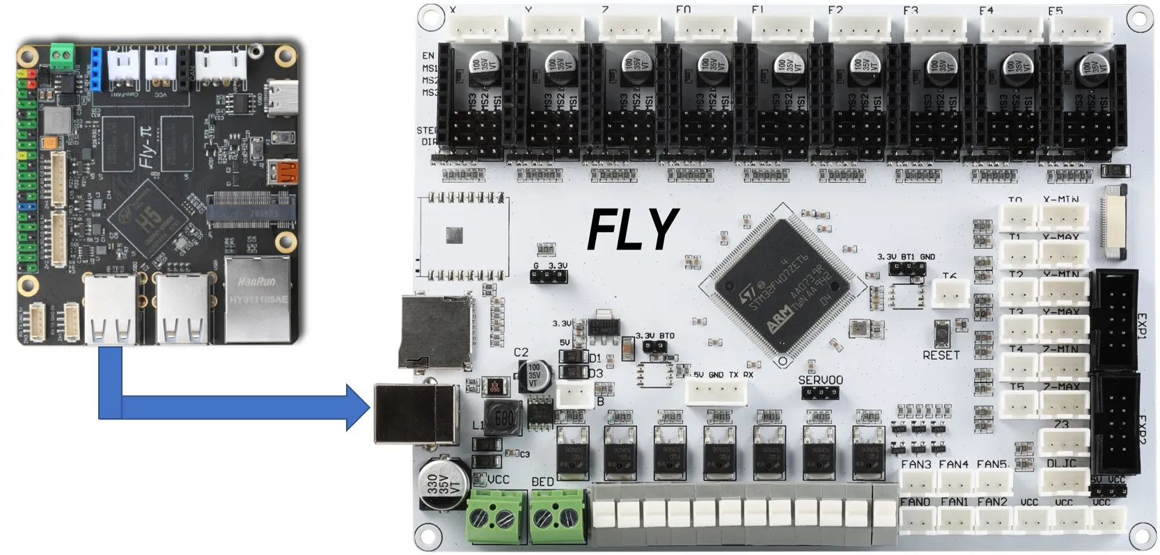La carte mère est connectée à l'USB de l'hôte via une interface Type-B, ou peut être connectée à l'hôte via un port série. Ici, seule la première méthode est décrite.