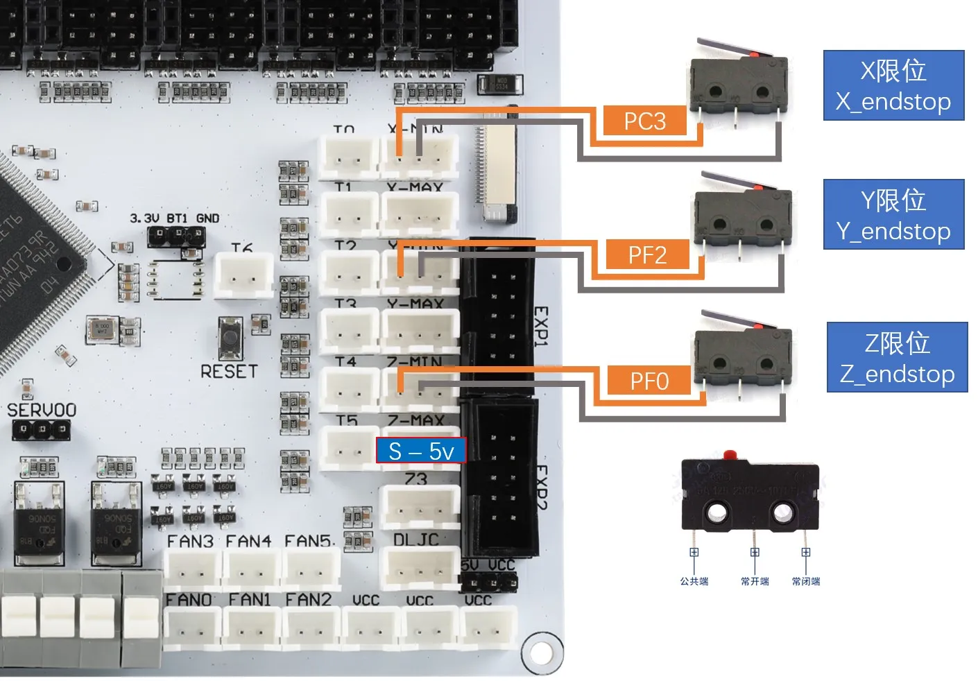 Les fins de course peuvent être normalement ouverts (NO) ou normalement fermés (NC). En général, dans une imprimante 3D, il est recommandé d'utiliser NC, de sorte que si un problème survient dans le câblage du fin de course, le système signalera une erreur, ce qui peut éviter des collisions inutiles et protéger l'imprimante contre les dommages.
