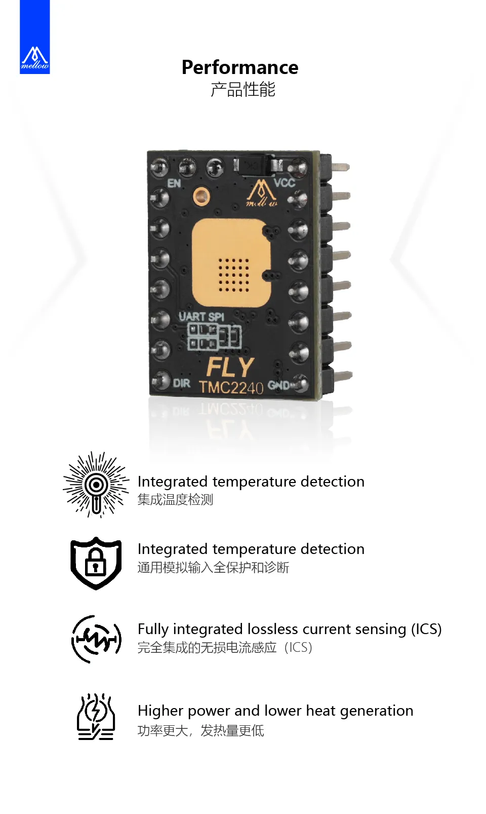 - Combinaison sans tremblement de StealthChop et SpreadCycle, résolvant le problème de rebond du moteur au point de commutation de la fréquence de découpage.