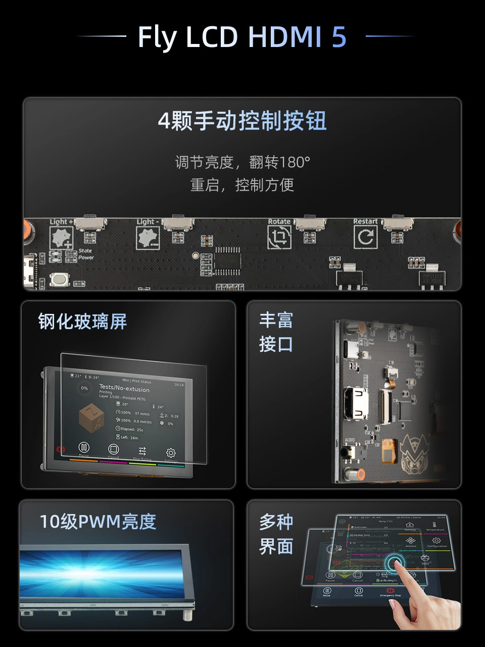 Cet appareil utilise un port unique de circuit imprimé flexible (FPC) qui peut être directement connecté à la carte mère principale de la conception Fly, sans avoir besoin de câbles HDMI ou USB. Cette connexion FPC simplifiée réduit l'encombrement des câbles et assure une interface propre et efficace. Bien que cette méthode de connexion avancée soit employée, l'appareil conserve également un port HDMI standard pour ceux qui préfèrent les options de connexion traditionnelles. En plus de la connectivité flexible, l'appareil comprend des touches de fonction intelligentes pour ajuster facilement la luminosité, faire pivoter l'écran et redémarrer. Un adhésif en mousse de haute qualité importé garantit une adhérence forte de l'écran et une excellente durabilité. La technologie de dissipation thermique à faible résistance des deux côtés améliore la sensibilité au toucher, offrant une expérience utilisateur plus fluide. La technologie de la lumière jaune fournit une restitution précise des couleurs avec une luminosité standard de 500, évitant la surexposition. L'écran est protégé par du verre trempé de haute résistance, assurant une protection robuste contre les dommages. Cet appareil est entièrement compatible avec des systèmes hôtes comme Raspberry Pi et utilise un design de port HDMI caché, les câbles étant soigneusement dissimulés à l'arrière de l'appareil pour un aspect propre et professionnel. Son design de circuit haute performance garantit un fonctionnement sans faille, ce qui en fait le choix idéal pour une imprimante 3D performante et fiable.