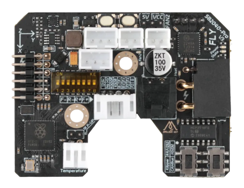 FLY SB2040 PRO V3 est une carte d'outils lancée par Guangzhou Mellow Electronic Technology Co., Ltd. pour la tête d'impression VORON Stealthburber. En utilisant cette carte, vous pouvez remplacer les câblages complexes entre la carte mère et la tête d'impression par seulement quatre fils, optimisant ainsi la disposition. Le SB2040 convient pour les têtes d'impression stealthburner et afterburner, il intègre un transceiver CAN, un transceiver RS232, un port USB, un driver TMC2240, un capteur d'accélération LIS2DW, et trois ventilateurs contrôlables, entre autres fonctionnalités. Cette carte d'outils est compatible avec les firmwares Klipper et RRF.