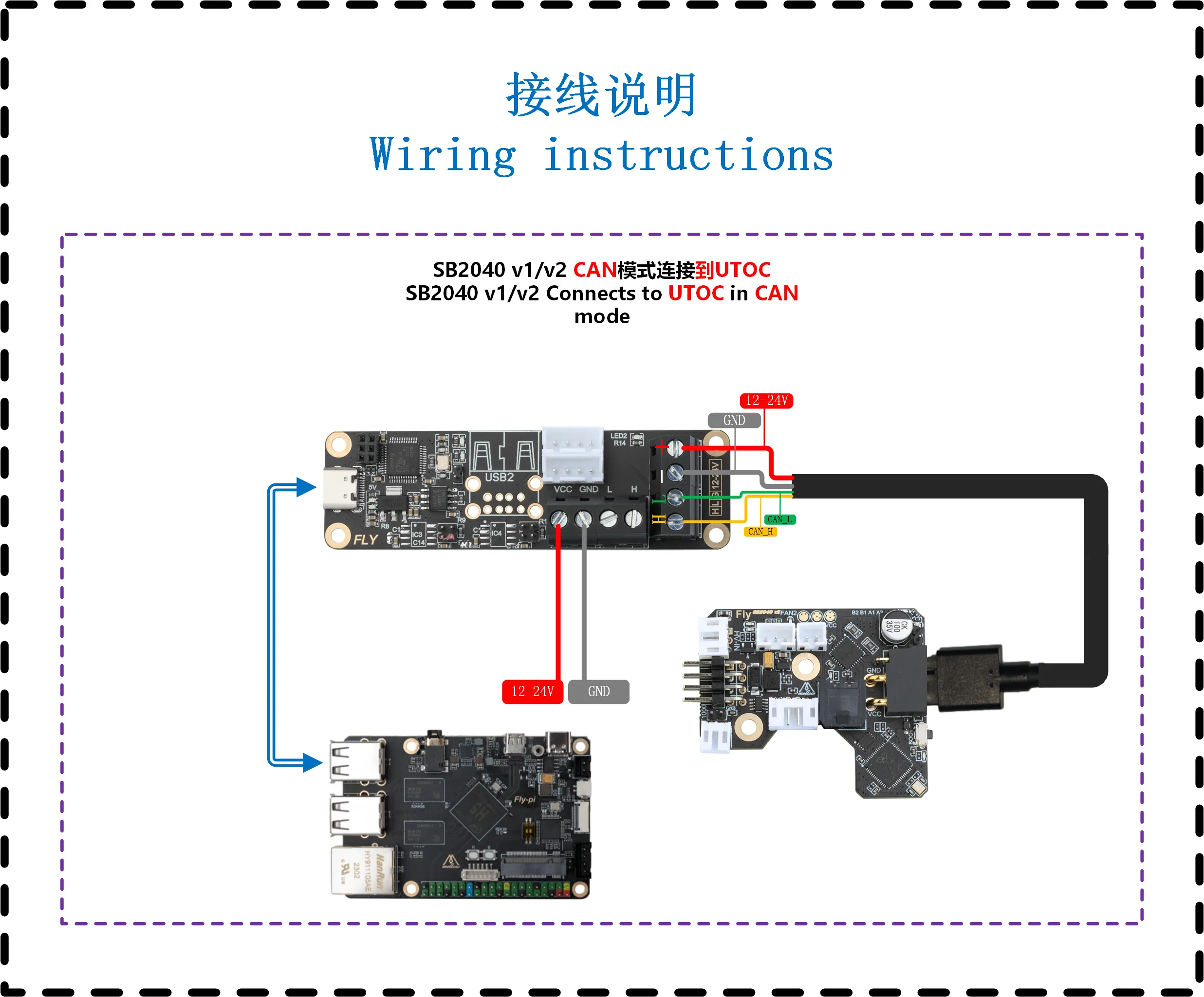 - Avant de flasher le firmware, connectez la carte d'outils à l'UTOC ou à une carte mère avec un firmware de pont via un câble de données XT30, ci-dessous se trouve un schéma de câblage de référence