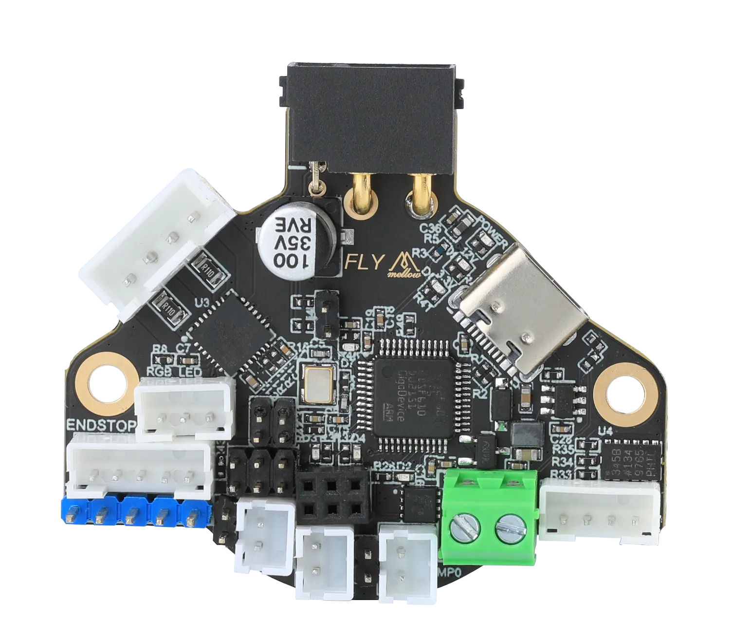 FLY SHT36 V2 est une carte outil pour la tête d'extrusion de l'imprimante 3D, conçue par Guangzhou Magnesium Electronic Technology Co., Ltd. En utilisant cette carte, il est possible de remplacer les câblages complexes entre la carte mère et la tête d'impression par seulement quatre fils, optimisant ainsi la disposition. SHT36 V2 est adaptée aux moteurs pas à pas de 36, et intègre un récepteur/émetteur CAN, un port USB, un pilote TMC2209, un capteur d'accélération ADXL345, deux ventilateurs contrôlables et d'autres fonctionnalités. Cette carte outil est compatible avec le firmware Klipper.