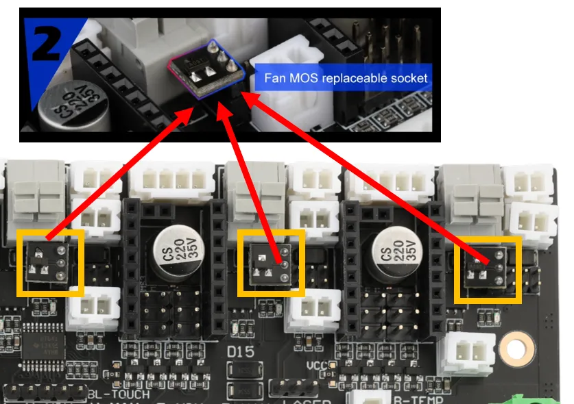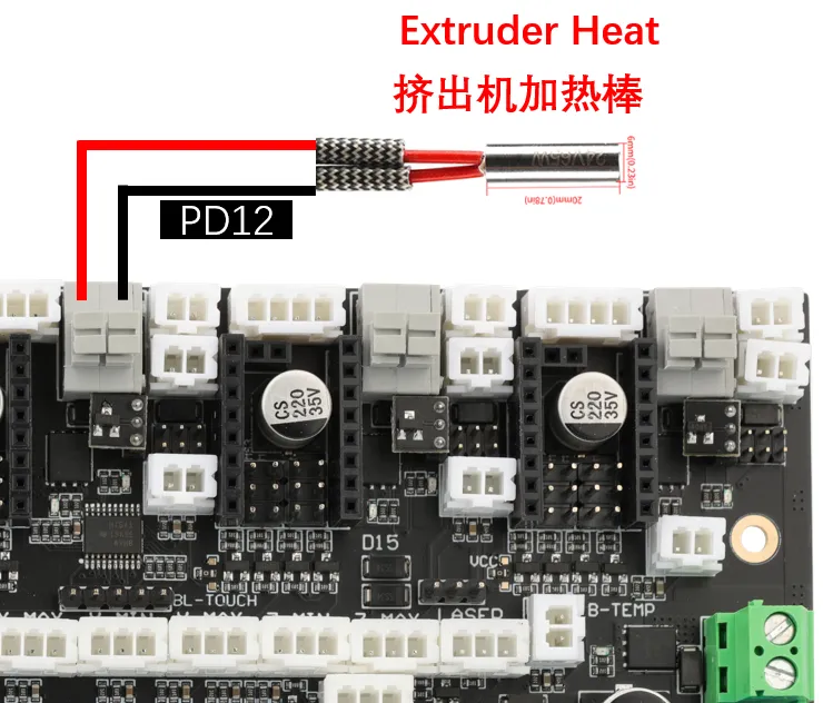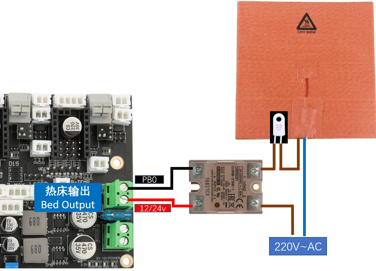 • 直流ヒートベッド: マザーボードに搭載されているMOSで直流ヒートベッドに接続する際には、電力の使用に注意してください。直流ヒートベッドの最大電流は10Aを超えてはいけません。10Aを超える場合は、外部MOSモジュールを使用してヒートベッドを使用することをお勧めします。そうしないとマザーボードに取り返しのつかないダメージを与える可能性があります。