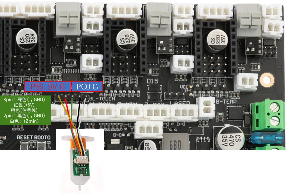 • BL-touchには5本の線があります。1組目は3本でセンサーの電源供給とプローブの展開/収納を担当し、2組目は地線と信号線で、リミット信号を出力します。BL-touchの配線を行う際には、線順を慎重に確認してください。誤った配線はセンサーとマザーボードを永久的に損傷させる可能性があります!!!以下の図に示すように配線してください。
