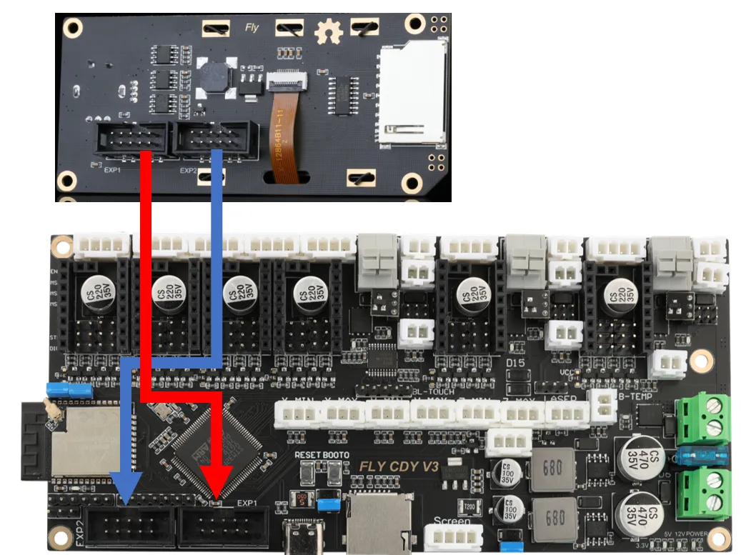 • 以下の図はFLYのmini12864の配線方法です。他のメーカーの画面については、それぞれのメーカーに問い合わせてください。Mini12864画面を逆に接続したり、間違った配線をすると、上位機がMCUに接続できなくなる可能性があります。mini12864画面を使用する前にMCUに正常に接続できていた場合、mini12864を使用した後に接続できなくなった場合は、mini12864の配線を抜いてみてください!!!