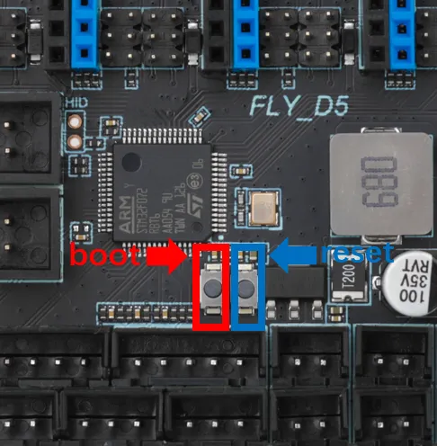 • 第二の方法:データ転送可能なケーブルを主板とデバイスに接続した後、BOOTボタンを押しながらRESETボタンを押し、RESETボタンを離してからBOOTボタンを離します