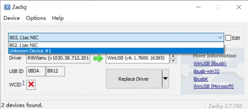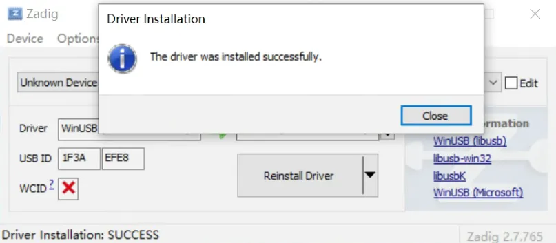 WinUSB(vxxxxxxx)のみ選択可能、ビルド番号は関係ありません Install Driverをクリックしてドライバーをインストール