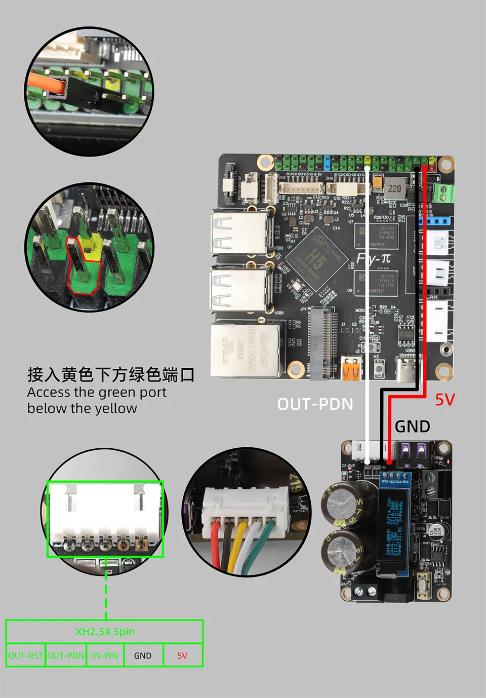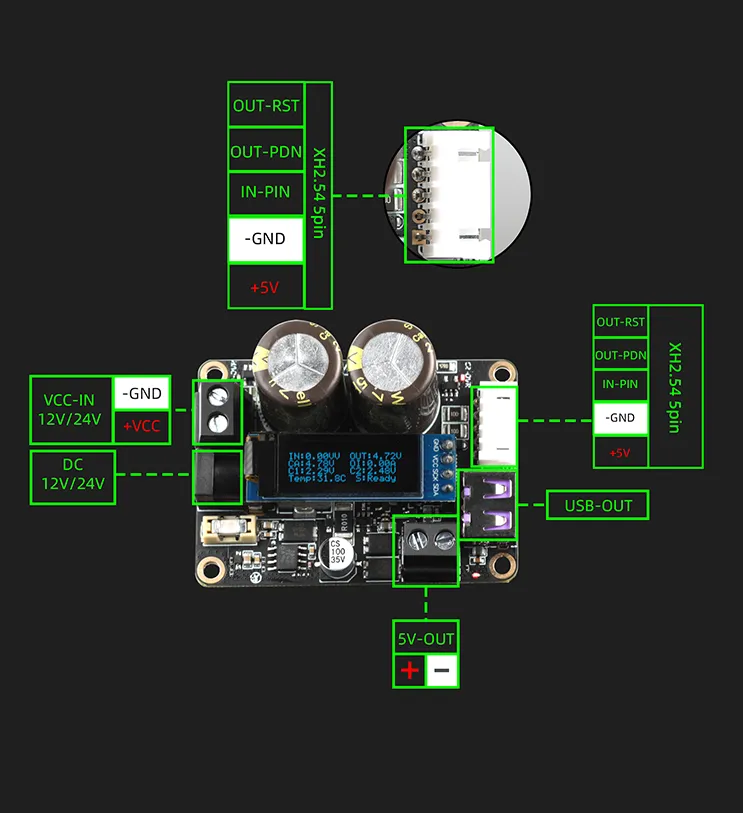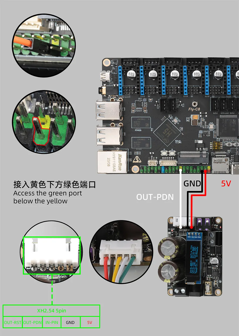 안전 종료 모듈과 함께 사용할 때, 12V-24V 전원을 사용해야 하며, 모듈이 정상적으로 작동하기 위해 안전 종료 모듈 내부 5V 출력 전압이 4.9V 이하로 떨어지지 않아야 합니다. 그렇지 않으면 안전 종료 모듈이 내부에서 부스트 전압을 취하게 되고, 커패시터가 지속적으로 충전 상태가 되어 모듈이 계속해서 열을 발생시킵니다.