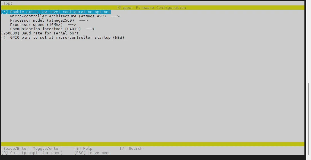 ESC,用于返回上一级菜单 Q键,用于退出Klipper固件配置页面Y键,在退出Klipper固件配置页面时,如果有提示,则点击Y键保存配置文件