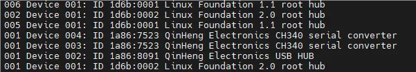 • 이제 상위 컴퓨터에 정상적으로 로그인했으므로 lsusb 명령어를 입력하여 장치를 검색할 수 있습니다. 다음과 같은 상황이 발생할 수 있습니다