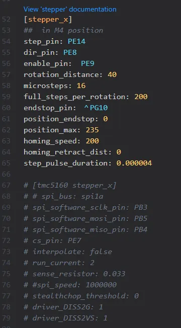 [tmc5160 stepper_x]또는[tmc2209 stepper_x]를 비활성화해야 합니다. microsteps:를16으로 설정합니다.step_pulse_duration: 0.000004를 추가합니다.- 모터 활성화: