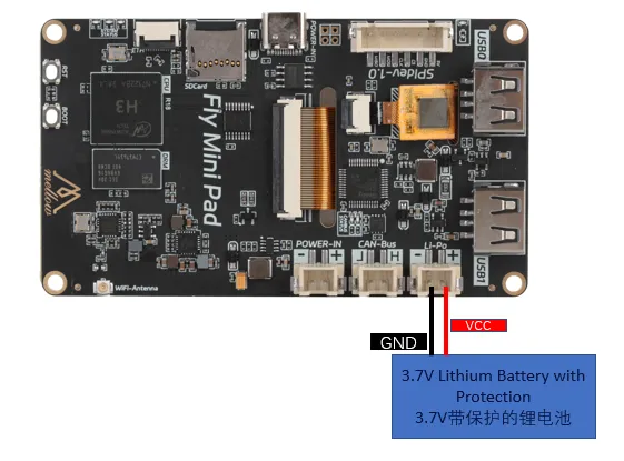 상위 컴퓨터 클래스프라이 미니 패드상위기기 전원 공급이 페이지에서상위기기 전원 공급 팁FLY-MINI Pad의 전원 공급 방식은 세 가지가 있습니다. 다음과 같이 연결하십시오. 12-24V 전원을 사용하여 전원 공급 TypeC 인터페이스를 사용하여 전원 공급 3.7V 리튬 배터리 인터페이스를 사용하여 전원 공급