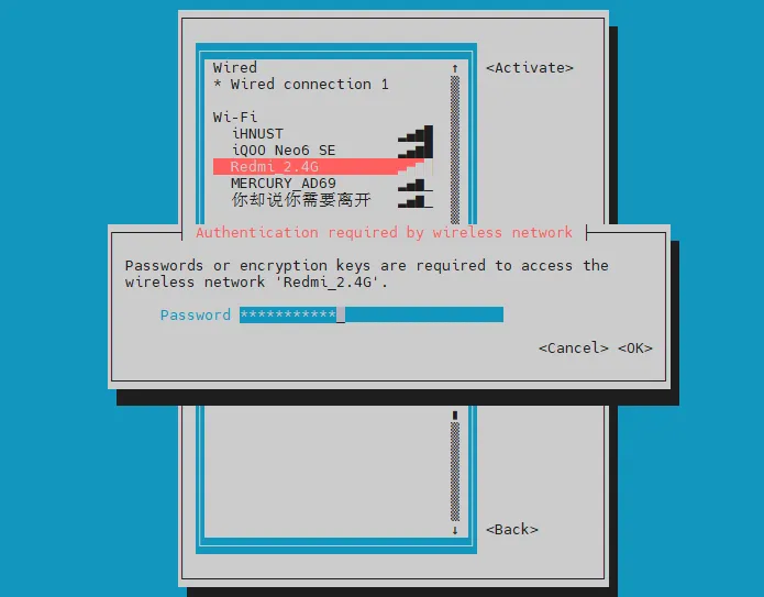 • 다음 화면으로 이동하면, 키보드의 ↑ ↓ 키를 사용하여 연결할 WiFi를 선택한 후 엔터를 누르고, 비밀번호를 입력하여 연결을 기다립니다.