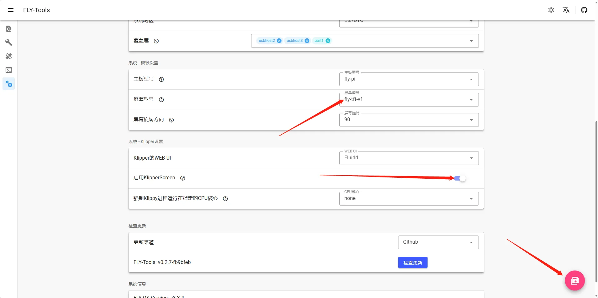 디스플레이 클래스TFT屏幕tft FPC 라인 도식도이 페이지에서화면 매개변수 수정 가이드 팁브라우저를 열어 IP:9999로 접속하여 FLY-Tools에 접근하세요. ::: tft 사용 시 아래 옵션을 활성화해야 화면을 사용할 수 있습니다. FLY Tools에 진입 후 첫 번째 단계는 fly_TOOLS에서 매개변수를 수정하는 것입니다. FLY TOOLS에서 아래 설정으로 화면을 구성하고 KS를 활성화해야 합니다. 도식도 LITE2 LITE2.1 fly-PI FLY-PI-V2 FLY-C8 Gemini v3