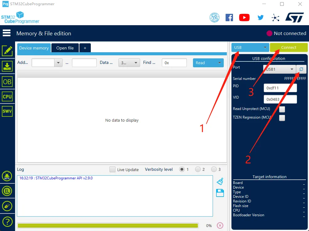 5. В STM32CubeProgrammer выберите режим USB, обновите и подключите