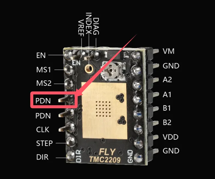 UART-пин драйвера FLY находится на четвёртом пине снизу слева, PDN-пин - это UART-пин. Если пины на материнской плате не соответствуют, UART использовать нельзя